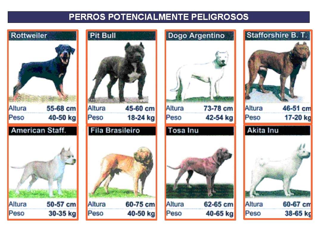 Las razas consideradas como perros peligrosos son Pit Bull Terrier, Staffordshire Bull Terrier, American Staffodshire Terrier, Rottweiler, Dogo Argentino, Fila Brasileiro, Tosa Inu y Akita Inu.