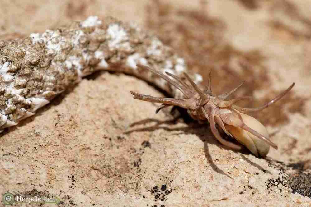 - La serpiente de cola de araña se oculta y evita el peligro.
