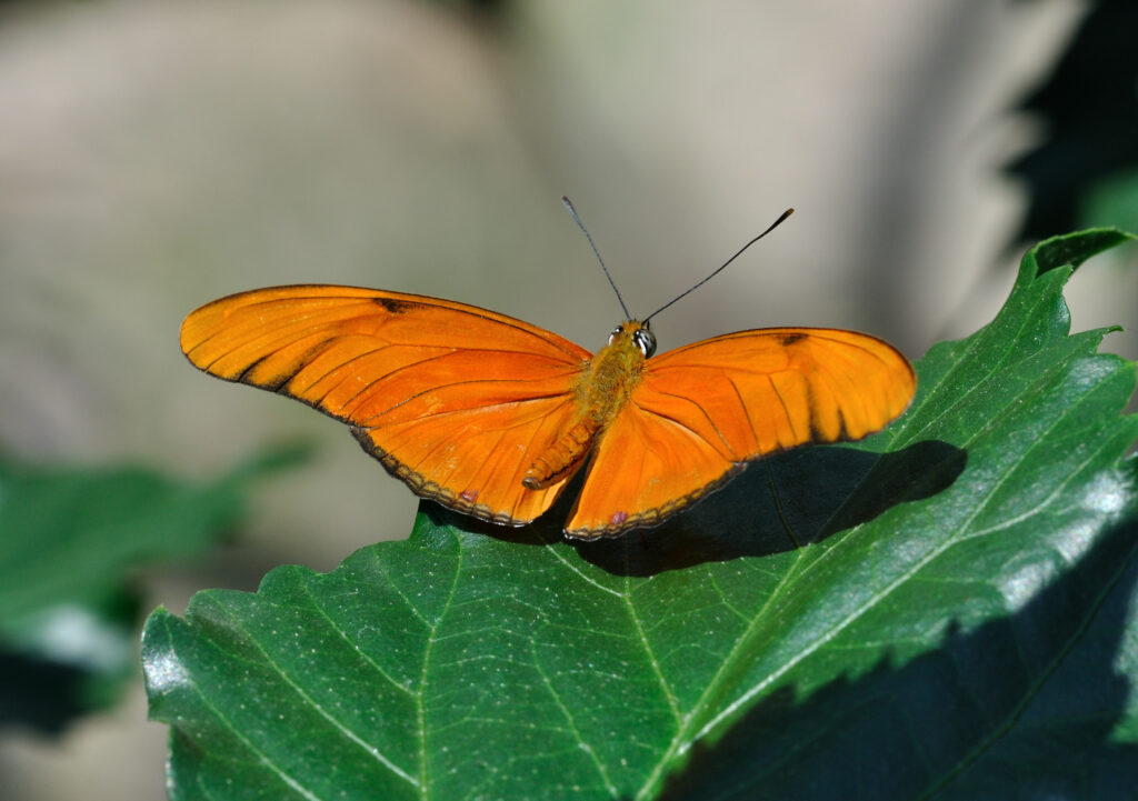 La mariposa de Julia (Dryas iulia) es una especie tropical de colores brillantes, con alas naranjas y bordes negros.